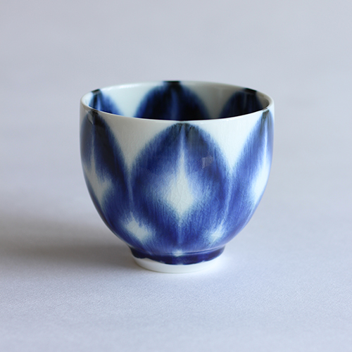『濃絞手』と名付けられた文様は、呉須で柄を描き、ガラスの釉薬を掛け、高温の窯で釉薬の動きを出すことで、伝統的な『七宝つなぎ』に滲みと濃淡が出て、花が開いたような柄になります。