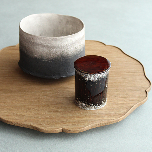 『素材である漆は、塗り重ねるたびに空気も積み重なり、それを研ぎ出すことは、色の層と共に重なり合った周囲の音や匂いまで磨き出すようで、そこに重ねてきた時間をも感じさせます。