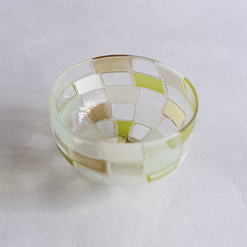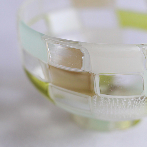 透明と白、黄緑、茶色の組み合わせのガラスの抹茶碗。
