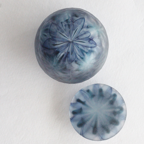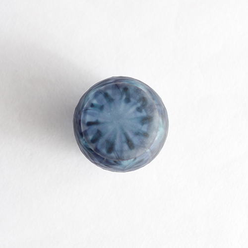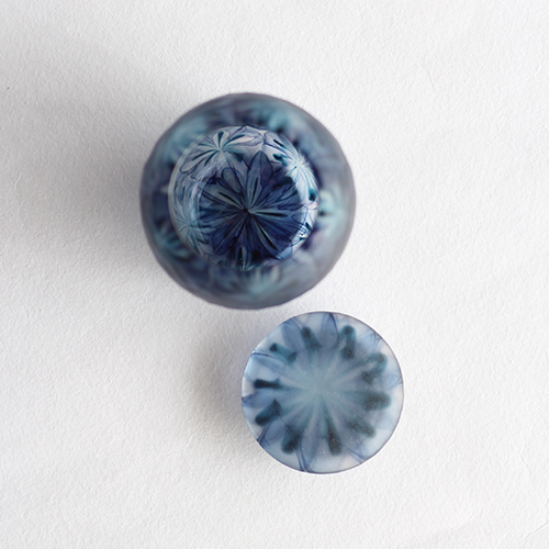 吹き上げた器をカットした際、根元に一つだけ現れる模様——まるで花が咲いたような、ひとつとして同じもののないかたち——その貴重な部分だけを集めて、改めて一つの器に仕立てています。