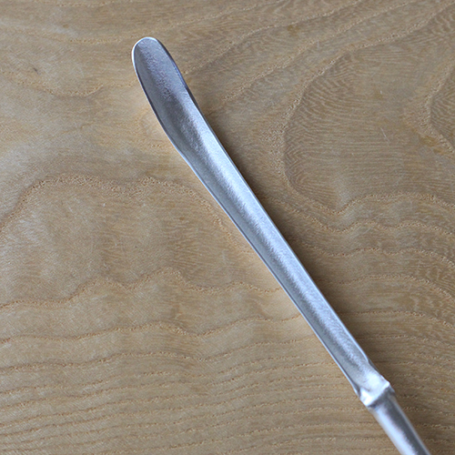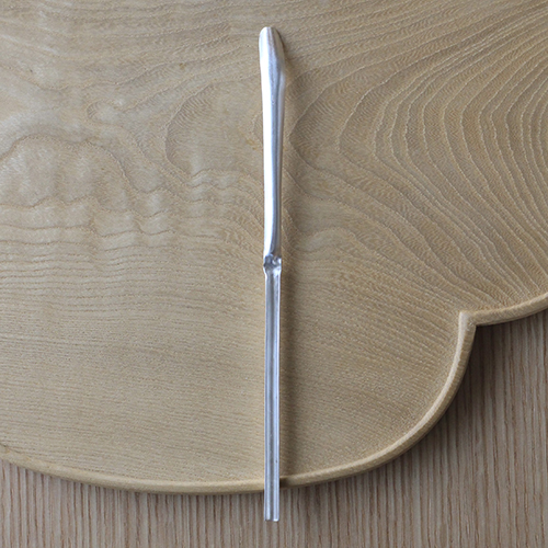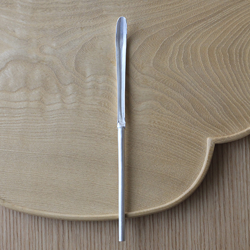 銀の板を即興で叩いたり曲げたりして仕上げた形です。型を使っていないので、偶発的に生じる地金の形や表情をお楽しみいただけます。