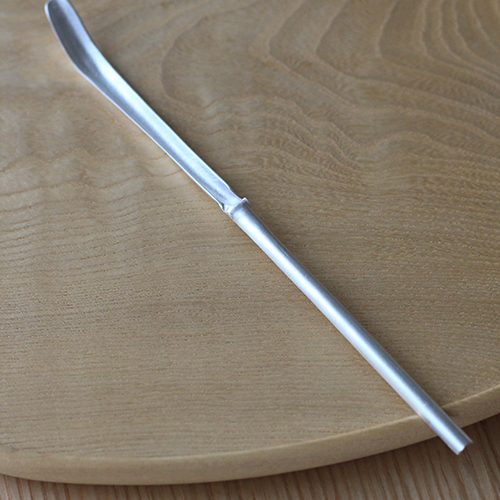 現在は、自宅に設えた茶室で身近な人とともにお茶を楽しみながら、日常に寄り添う道具づくりを続けています。現代の暮らしにも、古い道具にも調和する金工作品が、静かなお茶の時間をそっと引き立ててくれます。