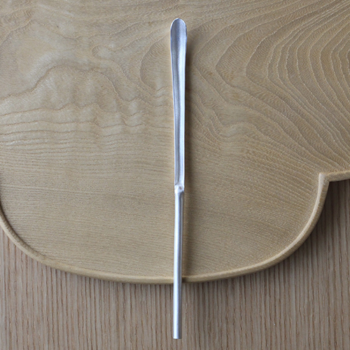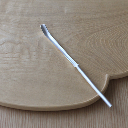 銀の板を即興で叩いたり曲げたりして仕上げた形です。型を使っていないので、偶発的に生じる地金の形や表情をお楽しみいただけます。