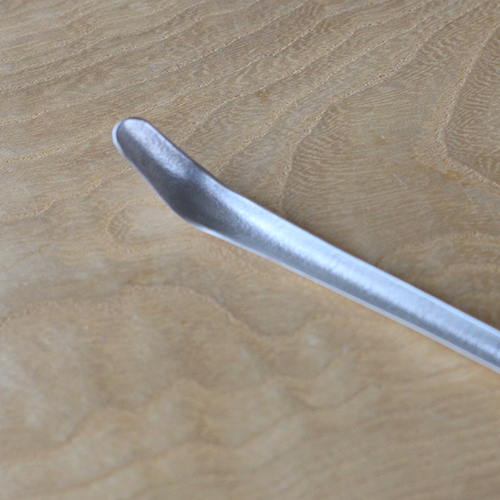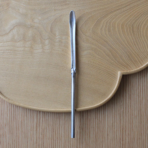 銀の板を即興で叩いたり曲げたりして仕上げた形です。型を使っていないので、偶発的に生じる地金の形や表情をお楽しみいただけます。