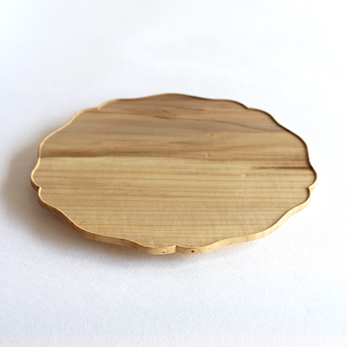 花弁のような輪郭が美しい木製のお皿で、縁が少し立ち上がっていることで、形の美しさがより際立っています。