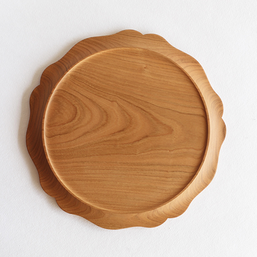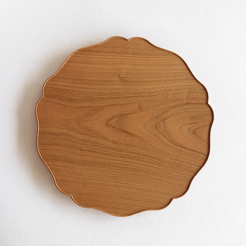 花弁のような輪郭が美しい木製のお皿で、縁が少し立ち上がっていることで、形の美しさがより際立っています。