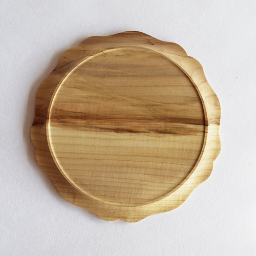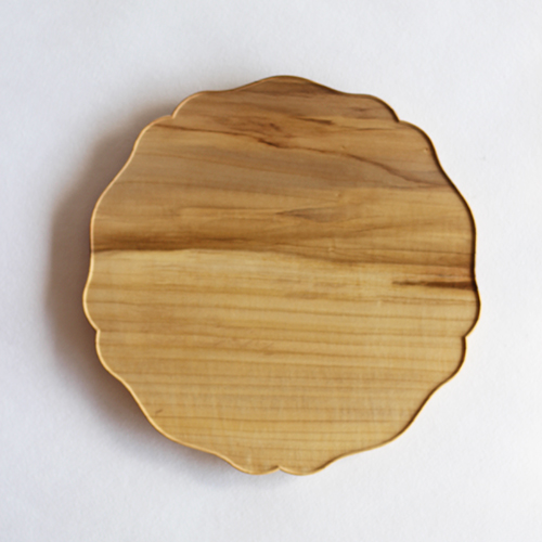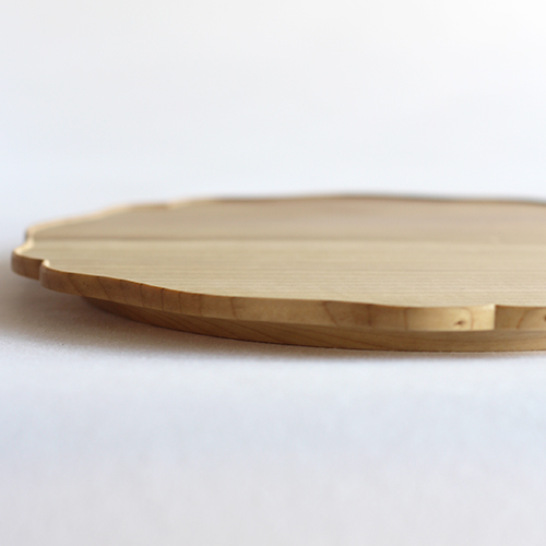 花弁のような輪郭が美しい木製のお皿で、縁が少し立ち上がっていることで、形の美しさがより際立っています。