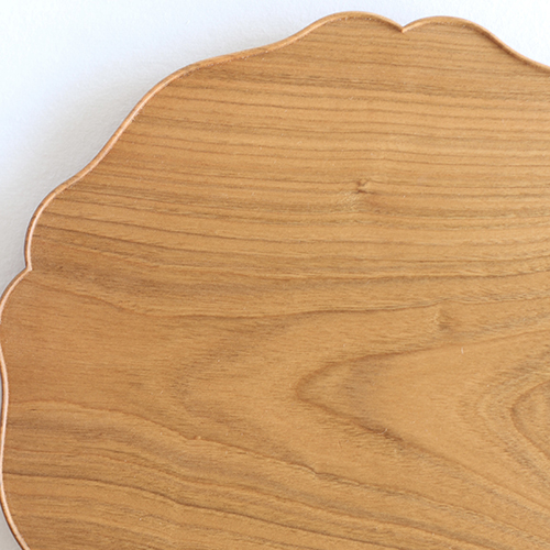 花弁のような輪郭が美しい木製のお皿で、縁が少し立ち上がっていることで、形の美しさがより際立っています。