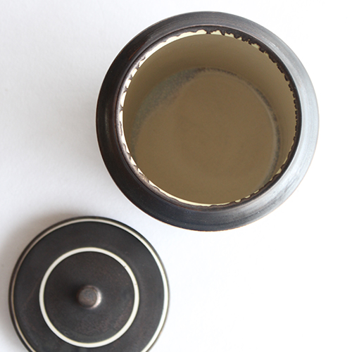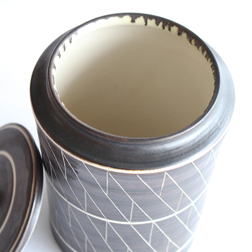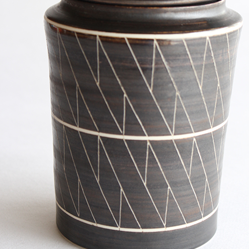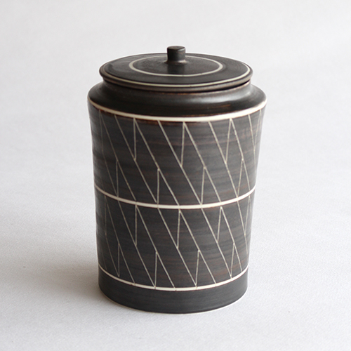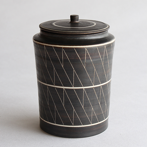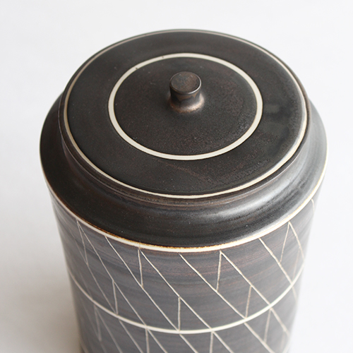 小関康子さんの蓋物大(茶釉線刻幾何文)です。