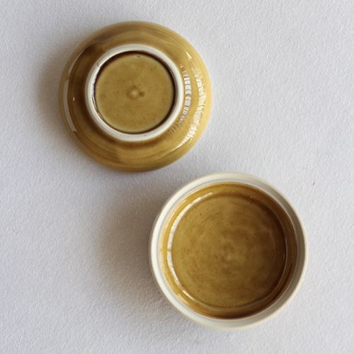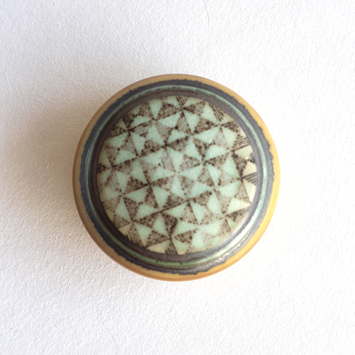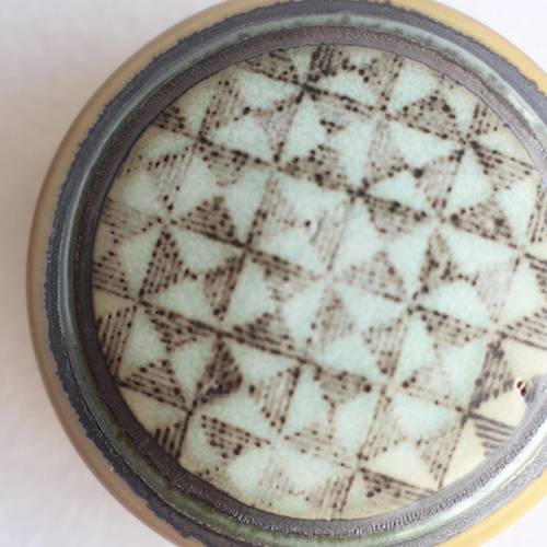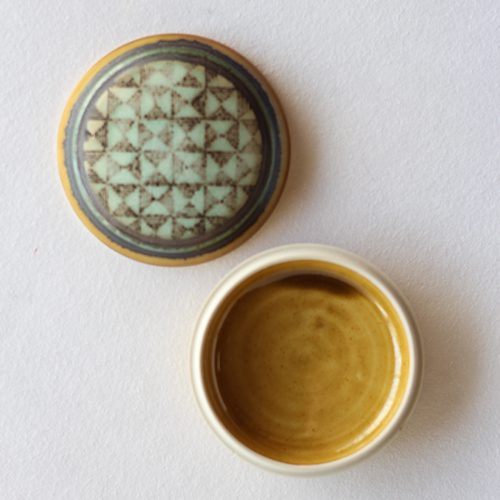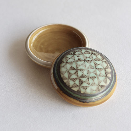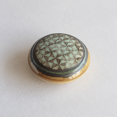 小関康子さんの香合(グリーン象嵌黄飴)です。