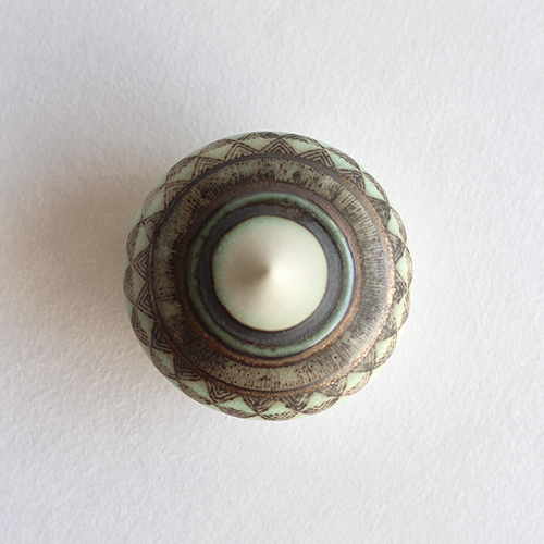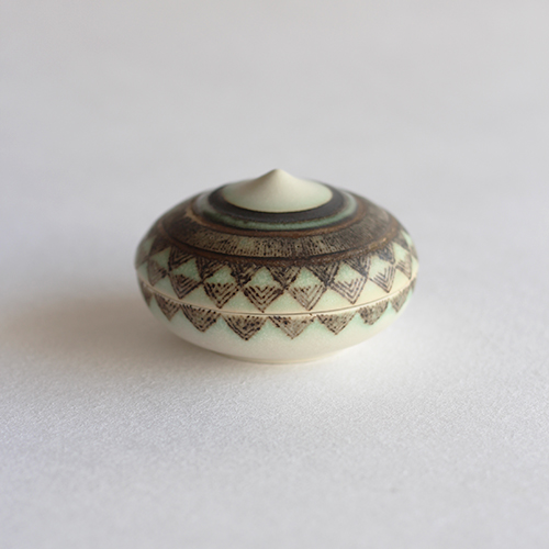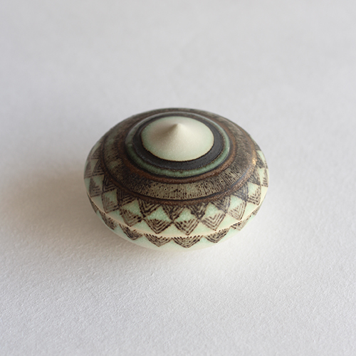 小関康子さんの香合(グリーン象嵌三角市松)です。