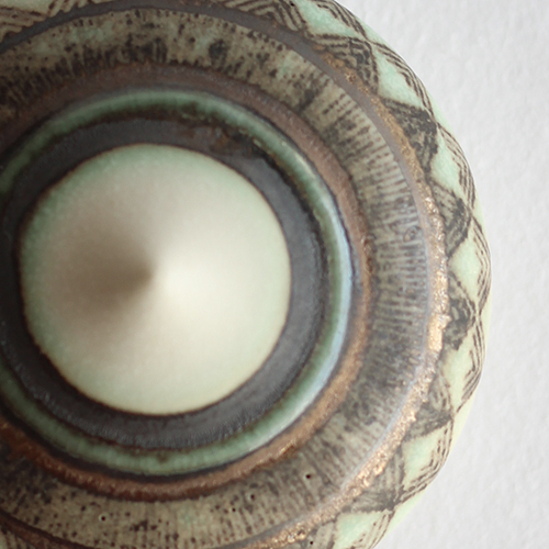 緑色に発色した部分は線を掘った後、粘土を嵌め込み、窯の中で発色させる象嵌という技法で作られています。