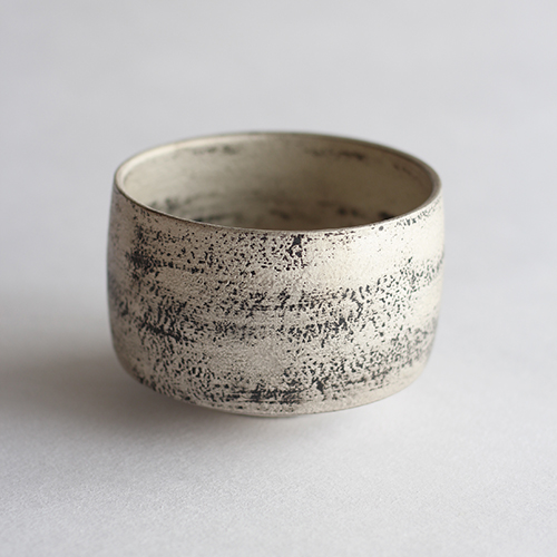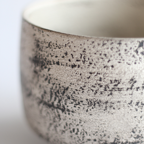 「侘び銀彩」という、銀彩に塗り物でいう根来のようにところどころ黒が現れて、華やかさ中に渋さもあります。表面のテクスチャーにもこだわり、表情豊かな作品になっています。